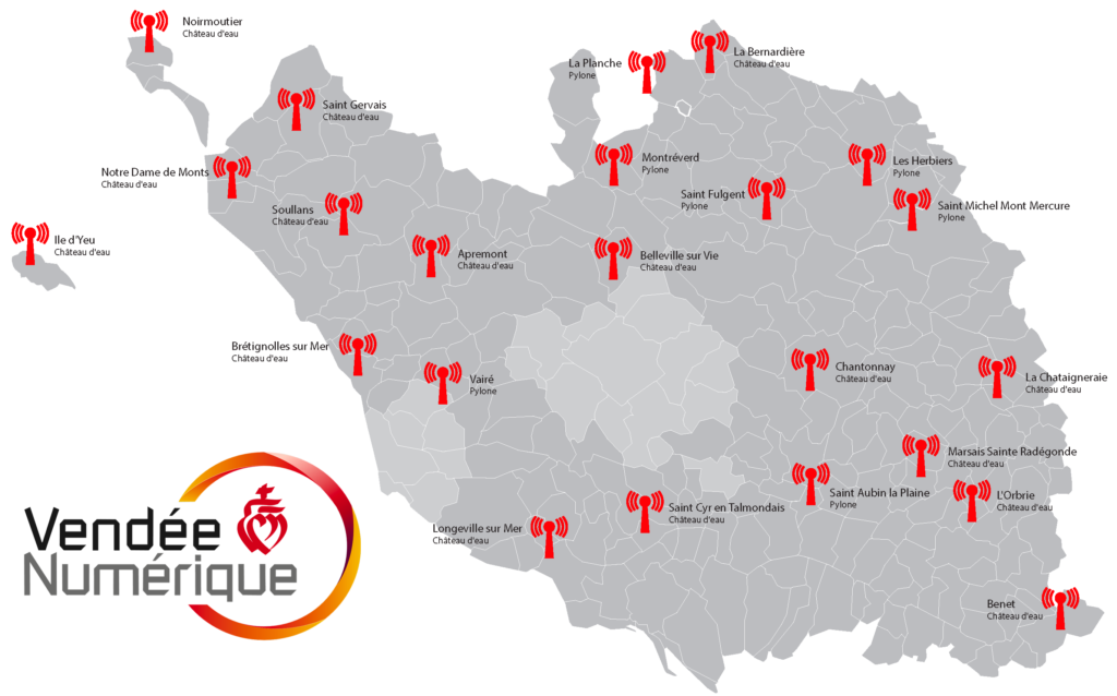 Les émetteurs permettent une couverture majoritaire du département, en dehors des zones AMII et des zones de déploiement FTTH (13 Communes Vendéennes).